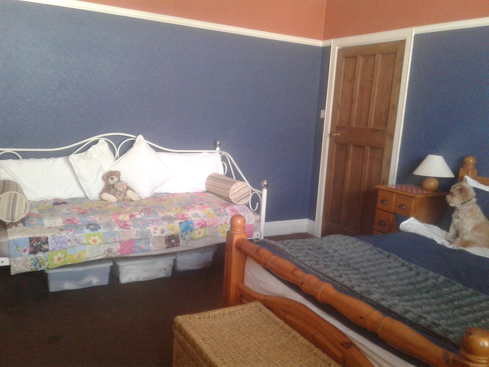 The master bedroom has a comfortable double bed together with a single day bed which can be made up for sleeping if required. There is a hair dryer on the dressing table, plenty of wardrobe and drawer space for your belongings, so you can make yourself at home.